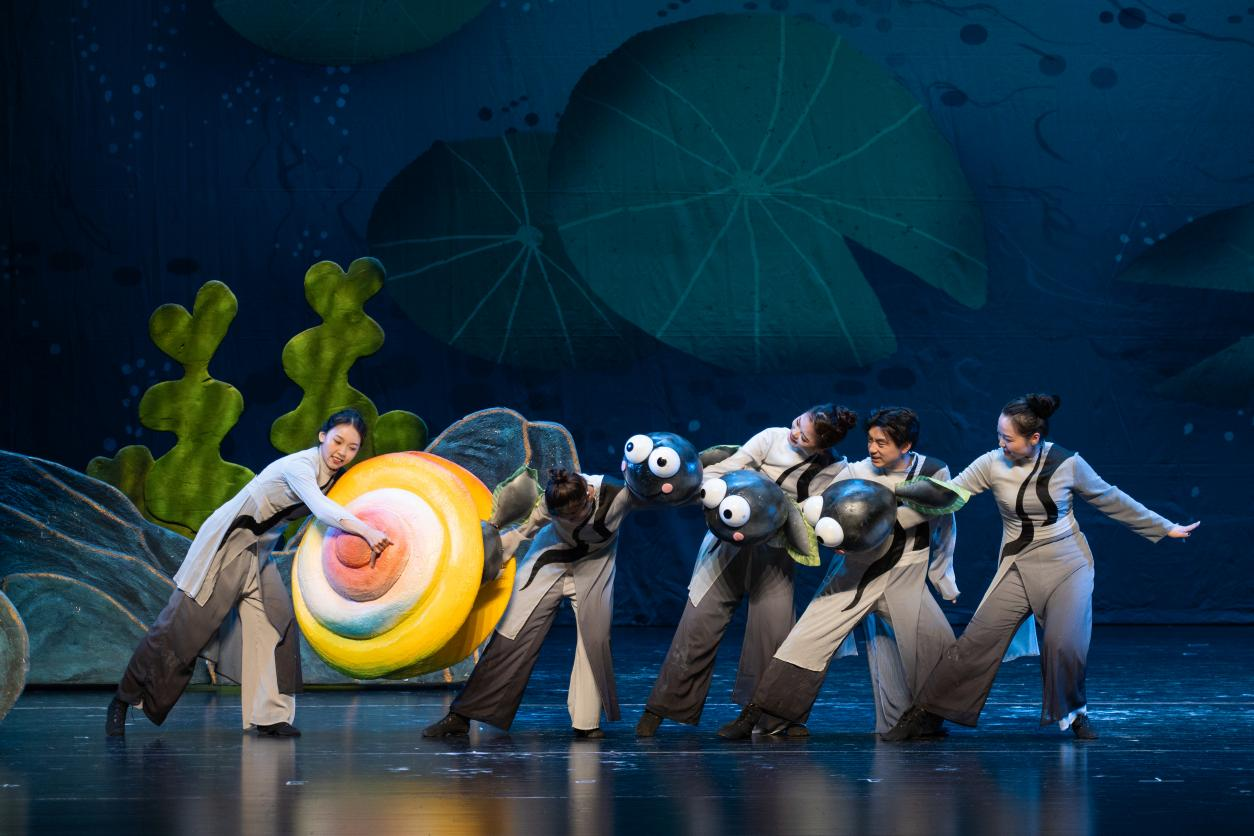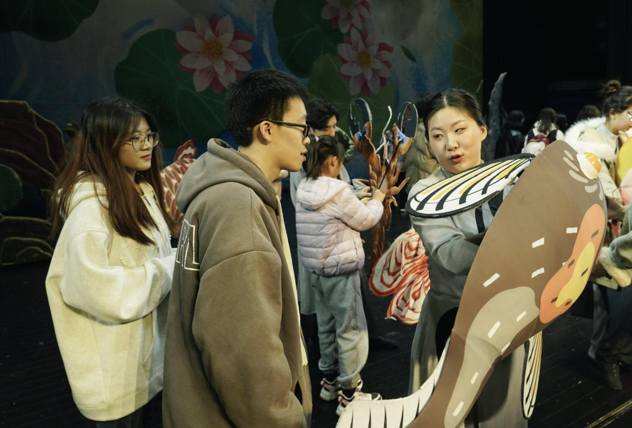 活动中,师生共同观摩了原创水墨动画儿童剧《小蝌蚪找妈妈》。该剧以中国水墨画为视觉基底,融合现代舞台科技,将经典童话赋予诗意表达。水墨与戏剧的结合既保留了东方美学的神韵,又充满童趣和科技感。演出结束后,师生走进后台,从“平片立体偶”制作工艺,到融合传统木偶技法与机械操控的表演细节;从水墨背景的动态投影设计,到舞台声光系统的联动编程,深度探秘剧目创作全流程。在互动、实践环节中,师生登上舞台,在剧场技术团队指导下化身“临时演员”,在环形声场中即兴高歌,亲身体验顶级声学设计带来的震撼效果。