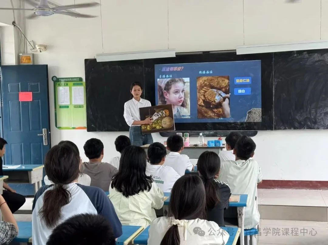 捐赠仪式后,许昌学院教师团队与陈曹乡初级中学教师展开座谈。双方围绕美育课程开发、教师科研能力提升、校本课程建设等议题深入交流。课程中心公共艺术教育中心主任宋延生、美术与设计学院美术教育系主任杨璐、国画教研室主任李岩、区域美术发展研究中心主任李海鹏等教师,针对学校美育课程现状提出建设性意见。与此同时,许昌学院2022级美术学专业学生申博雅在教室开展美术学科送教活动。她以“油画赏析”为主题,引导学生去发现美、传播美。
