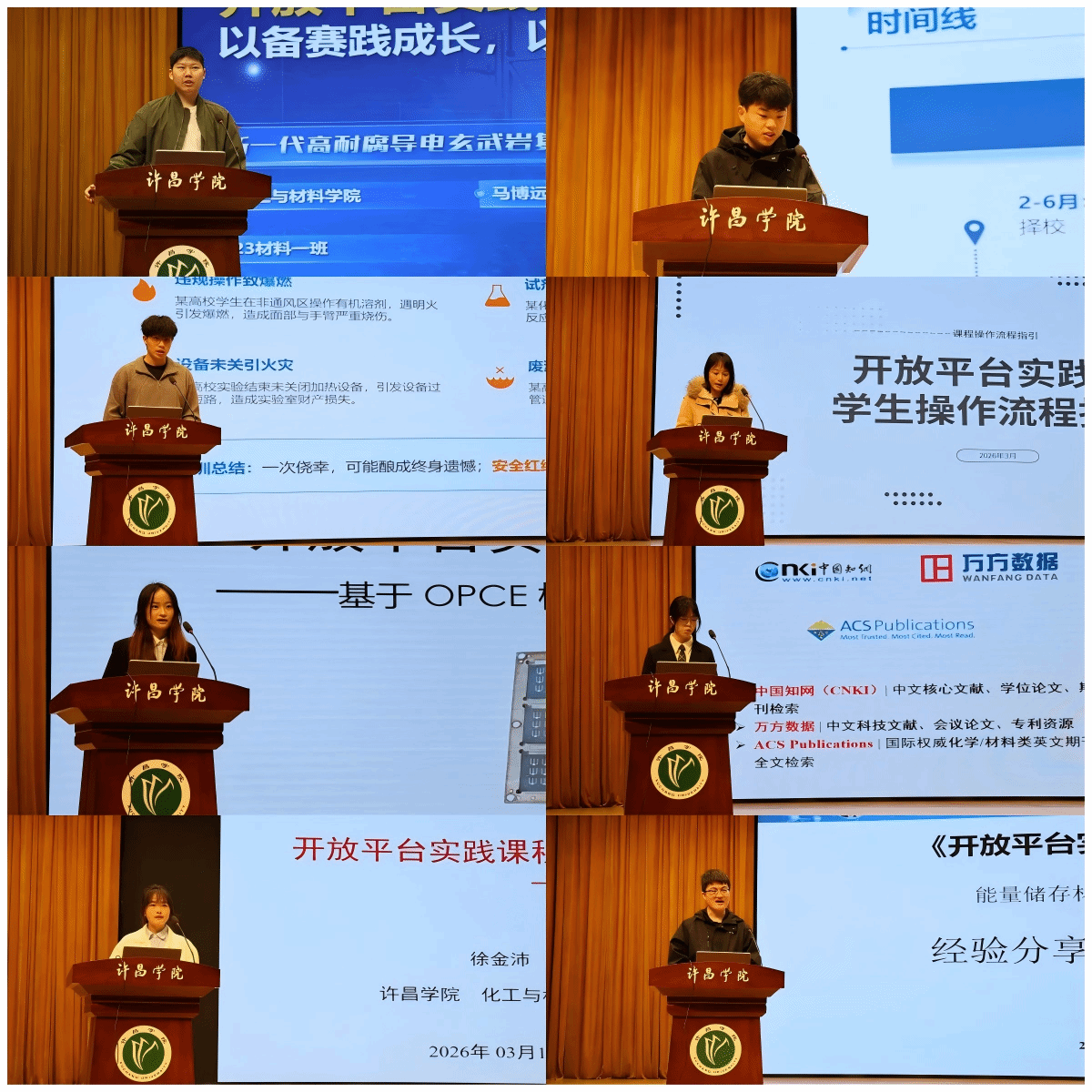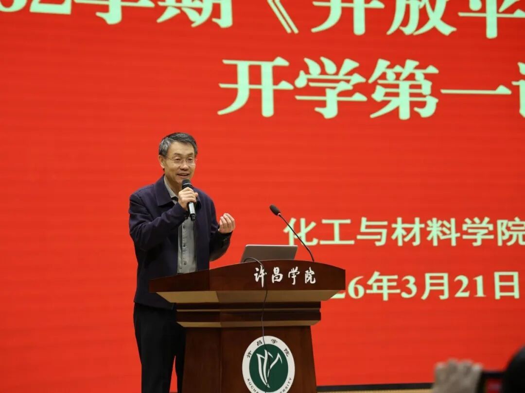 2026年3月21日,我校在智慧大楼演播厅举行2526-2学期国家级一流本科课程《开放平台实践课》第一课活动,许昌学院校长、课程负责人郑直教授、化工与材料学院党委书记许志红教授、表面微纳米材料研究所所长何伟伟教授、化工与材料学院党委副书记张学燕、副院长李品将教授,以及师生代表五百余人现场参与。第一课由2025级材料科学与工程专业程诗涵同学主持。